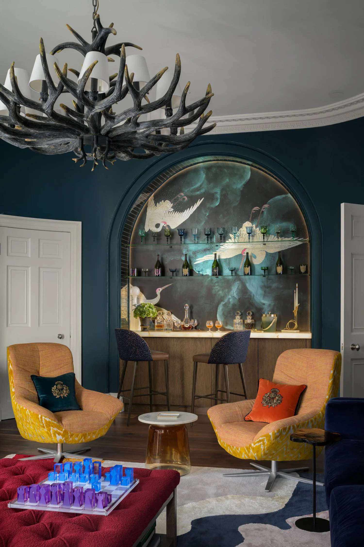 For the bar, we commissioned custom cabinetry to give the stunning arched alcove a new purpose, and we chose a striking iridescent mural and a lit onyx-effect bar top for the ultimate home bar set up. Bespoke antique glass tiles were cut to size to follow the curve up and round, completing the look.