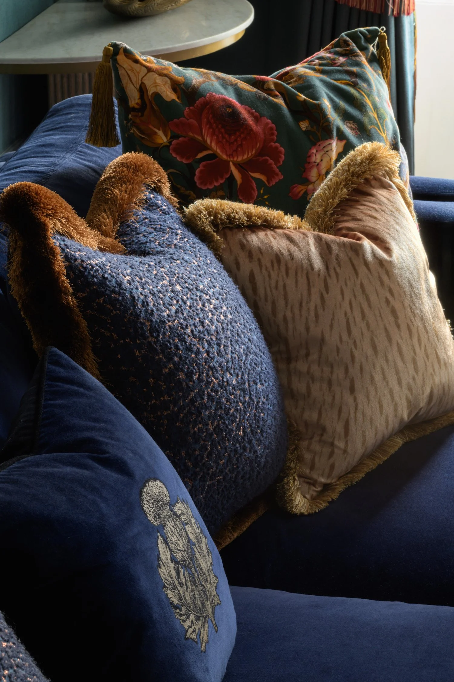 Given the clients’ two dogs, durability was essential. A deep blue, washable velvet was selected for their bespoke Charlotte James sofas — luxurious yet hardwearing. Jewel tones of amber, ruby and blue complement the rich teal backdrop.