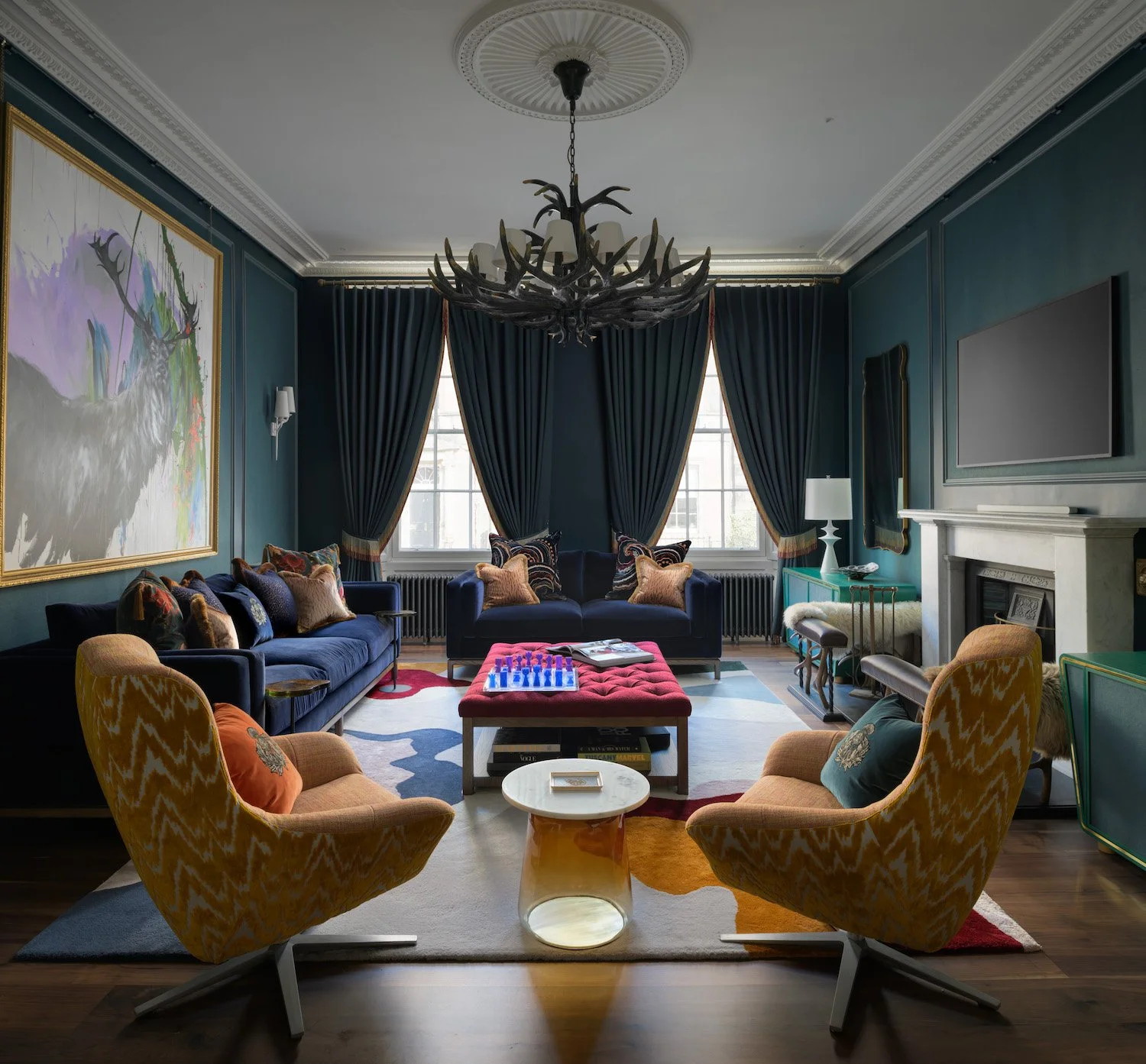 Relocating back to Edinburgh from Dubai with their two adorable Yorkshire Terriers, the clients purchased this renovated city centre townhouse, and while the house was beautifully decorated, it wasn’t feeling very ‘them’. Our brief was to transform the drawing room into a formal living space with wow factor. Inspired by the home of The Traitors, it needed to be bold and colourful, a place perfect for both cosy movie nights with pizza and lively cocktail parties. We incorporated the fireplace, chandelier and fender, alongside some of the clients’ existing pieces, such as the two swivel chairs which we then had reupholstered to work with the new colour palette.