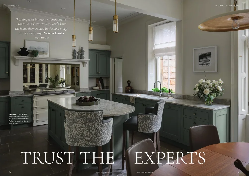The Wallace family's period townhouse in Morningside, Edinburgh underwent an extensive makeover by Jeffreys Interiors. Initially intending only to update their living room, the project - view here - expanded to include multiple rooms over five years, transforming the home with luxurious yet practical designs.